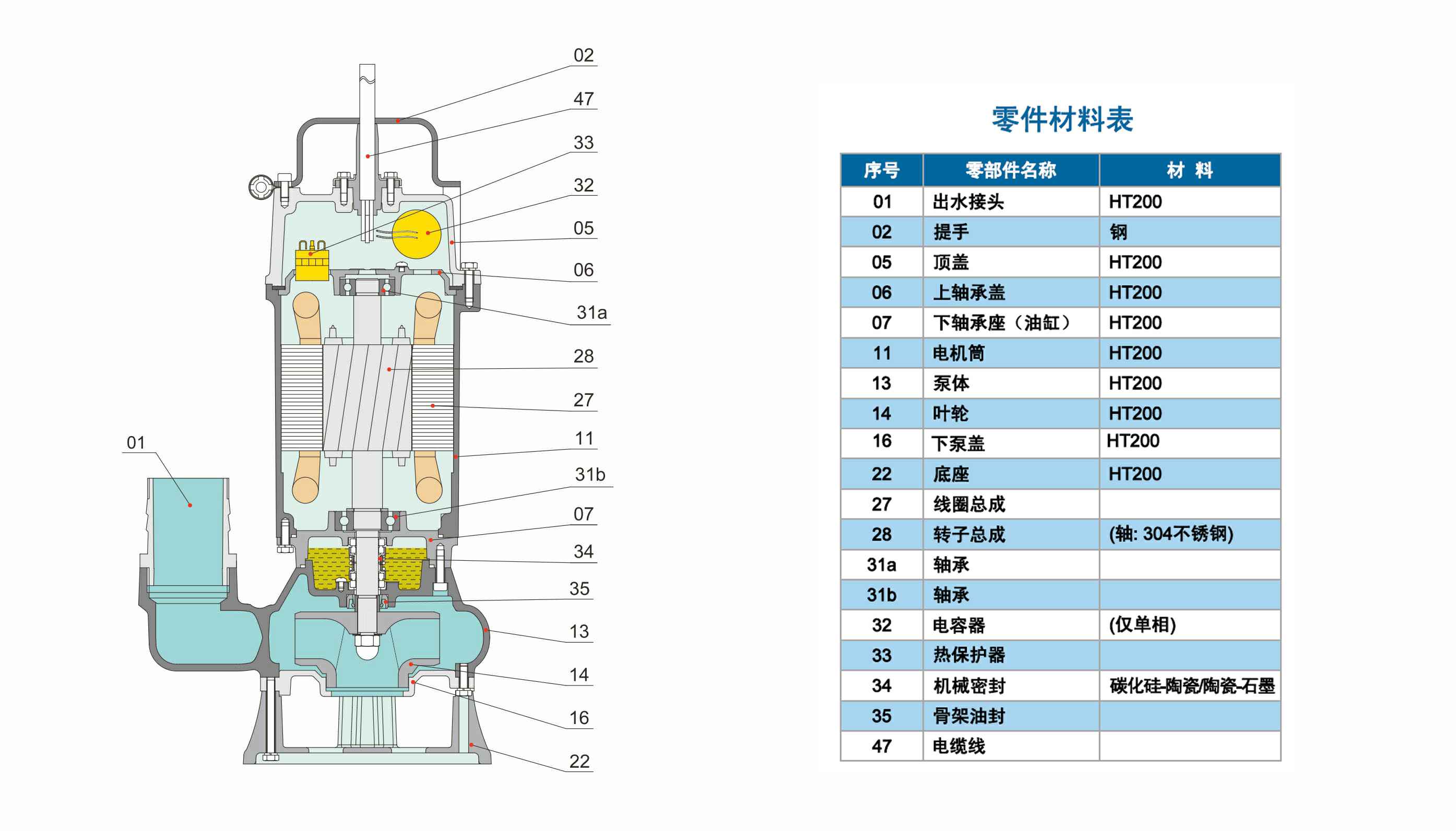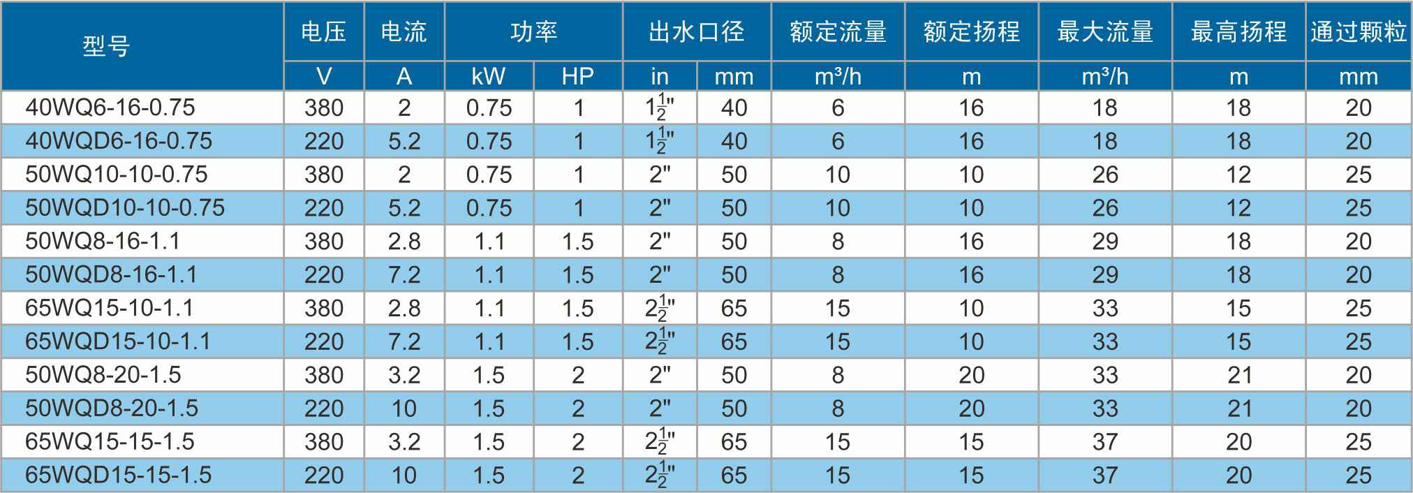 WQ系列双流道潜水排污泵结合了国内外同类优秀产品,经过PCAD软件优化设计而成,在水力模型、结构、密封、冷却和保护控制等方面进行了综合优化和创新设计。叶轮为双流道设计,有较大的进口和出口宽度,无堵塞性能好,高效节能,安全可靠,寿命长。